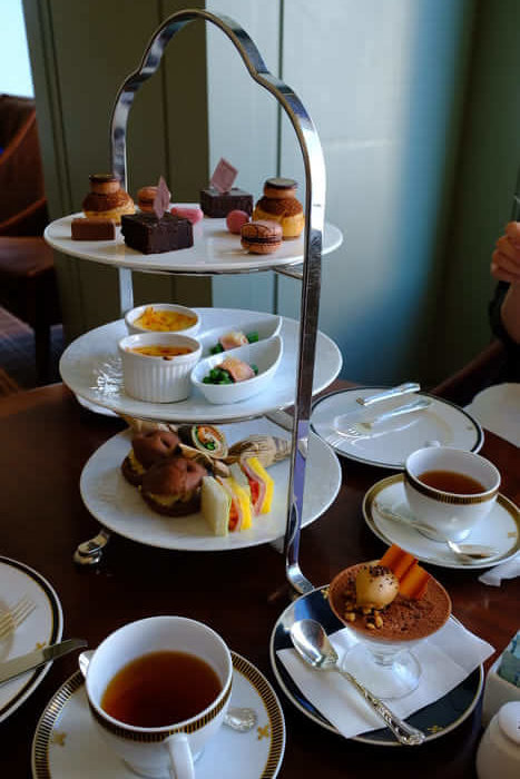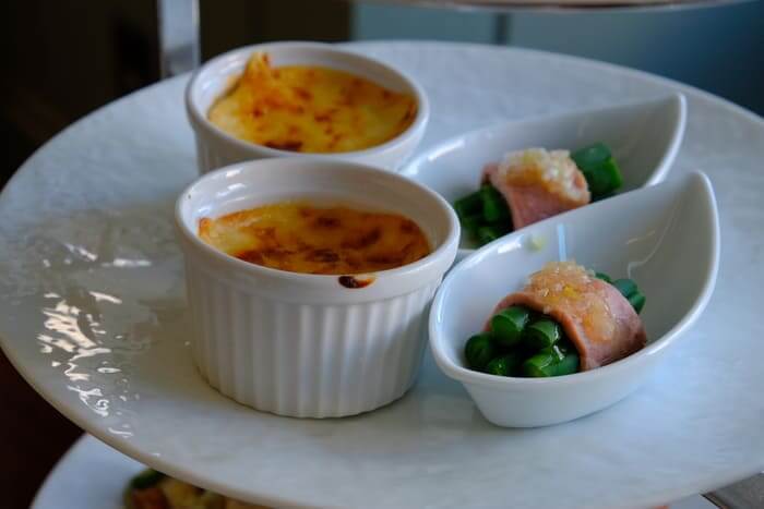 伝統的な3段アフタヌーンティーです。横にあるチョコレートムースのグラスデザートは市川シェフがこのアフタヌーンティーの為に考案されたもの。上にチョコレートムース、下にレモンのジュレのさっぱりとした美味しいムースでした。