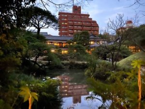 外の道を通って大浴場がある宿泊棟に行けます。庭園が綺麗でした。